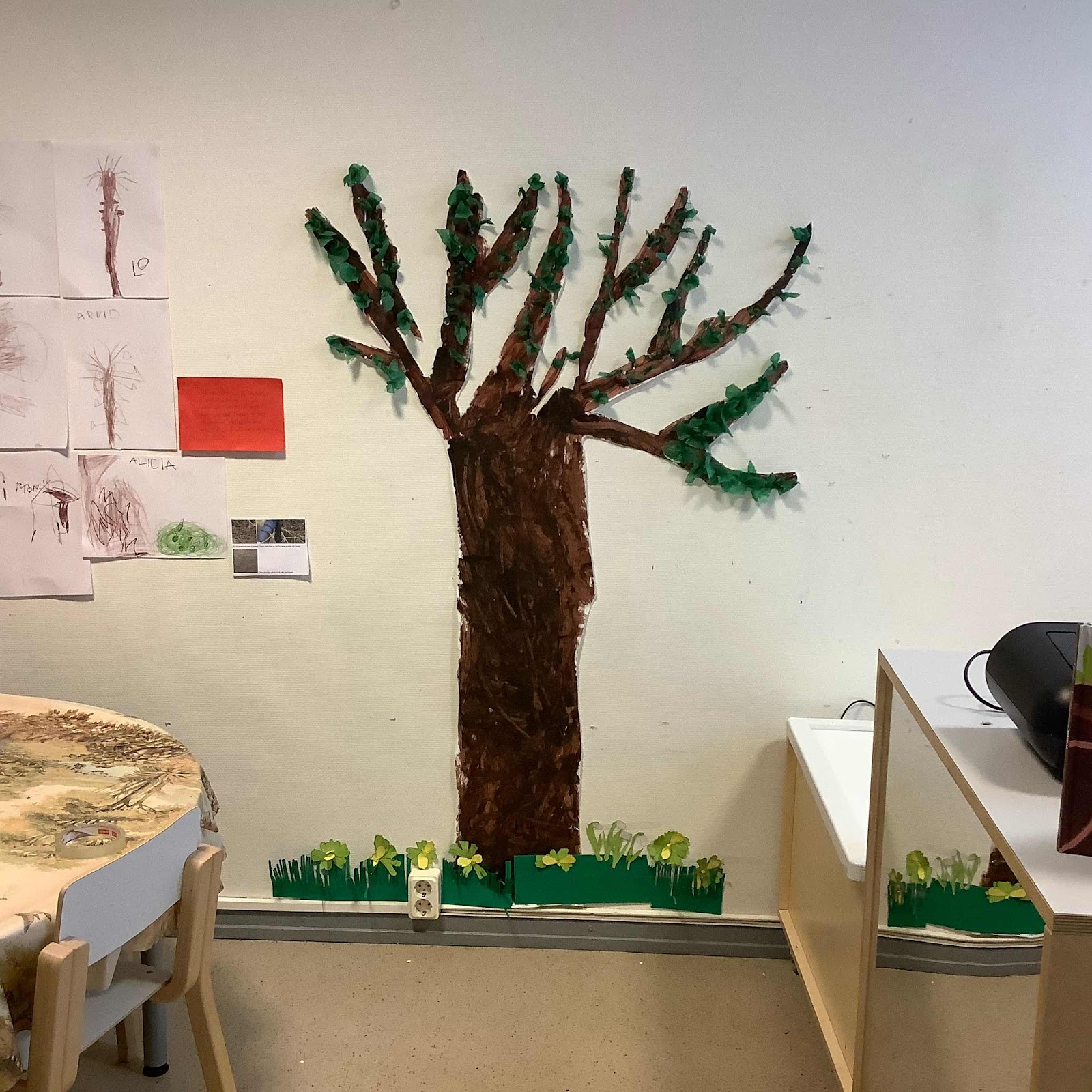 Vårt årstids träd då vi upptäckte på utflykten att det fanns knoppar. Vi har även satt upp en fågelholk och vår blommor.